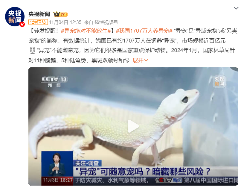 在我国,异宠的需求和交易快速增长。《2025年中国宠物行业白皮书(消费报告)》显示,2024年饲养异宠的人群持续上升;有数据统计,我国已有约1707万人在饲养异宠,市场规模近百亿元。然而,饲养异宠容易与外来物种入侵、国家重点保护动物交易等问题发生冲突,也给监管工作和生态安全带来严峻挑战。