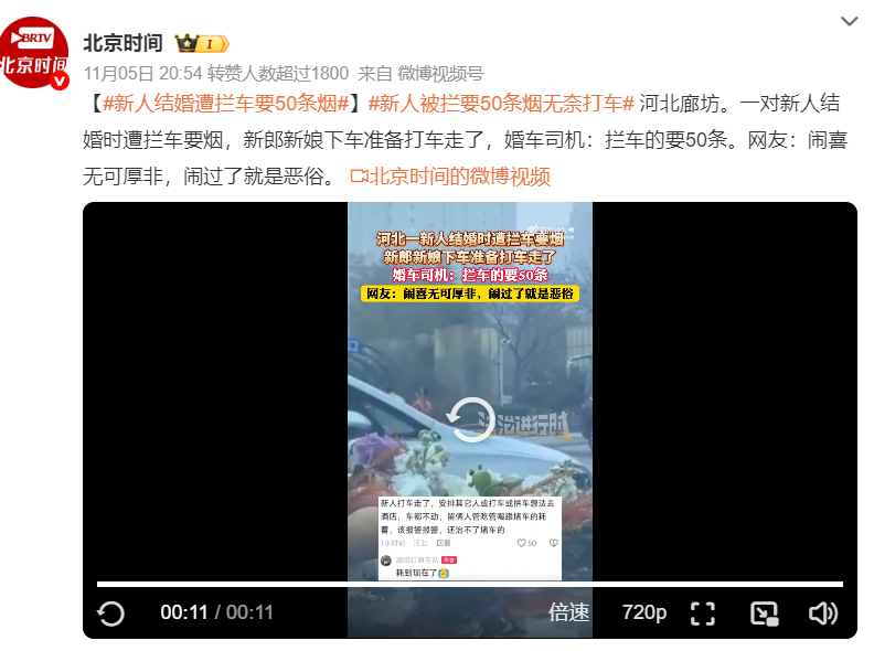 婚俗中的“讨喜”,本是邻里亲友间基于自愿的善意互动,承载着对新人的祝福与美好期许。向新人讨一颗喜糖、一个小红包,或是说几句吉祥话,核心是图个热闹与喜庆,也体现了人与人之间的温情。但河北这起拦婚车索烟事件,显然已突破民俗的边界。50条普通香烟或10条高档香烟,价值动辄数千元,绝非小额“喜钱”所能比拟;而“不给就不让走”的行为,更完全违背“讨喜”的自愿原则。当祝福异化为要挟,不仅污染了纯净的婚俗文化,更侵蚀了公序良俗,让本该充满喜悦的婚礼蒙上阴影。