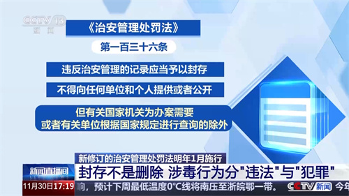 将于明年1月1日起实施的新修订《中华人民共和国治安管理处罚法》中第一百三十六条确立的“治安违法记录封存制度”近日引发关注,其中,因吸毒有治安处罚记录也在被封存的范围内引发热议。