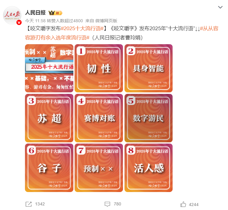 岁末的流行语盘点,是总结也是序章。语言记录当下的同时,也在凝聚共识、指引未来。在“韧性”中坚守生活的初心,在“活人感”中活出真实的自我,总结过往的得失以更务实的姿态面对生活。当亿万民众用鲜活表达定义生活,用奋斗故事书写传奇,新的一年将会涌现出更新、更美、更具创造力的年度热词。