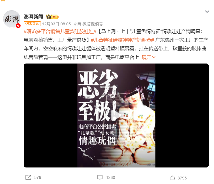 目前东莞、惠州两地多部门已介入调查,后续处理必须严格依照法律,该罚的重罚,构成犯罪的毫不留情地移送司法机关处理。但守护儿童不能仅靠媒体记者“单刀赴会”式的曝光,必须构建源头治理的长效机制。生产端应细化备案审核,明确儿童色情特征产品的判定规则,比如从身高比例、面部特征、性暗示程度等维度设定量化阈值,从源头掐断仿生设计。销售端需强化平台责任,建立关键词过滤、图像识别、用户举报联动机制,将违规商家列入黑名单,杜绝换个马甲再上线。更重要的是形成监管合力,市场监管、公安、网信等多部门不妨建立常态化联合执法机制,既严查生产源头,也严打销售渠道,让违法者无处遁形。