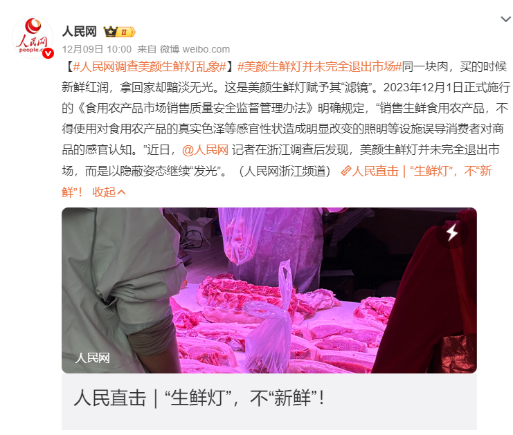 同一块肉,买时新鲜红润,带回家却黯淡无光。这并非食物会“变脸”,而是“美颜生鲜灯”为其加了层“滤镜”。2023年12月1日正式施行的《食用农产品市场销售质量安全监督管理办法》明确规定:“销售生鲜食用农产品,不得使用对食用农产品的真实色泽等感官性状造成明显改变的照明等设施。”但是,近日,人民网记者走访发现,美颜生鲜灯却并未完全退出市场,反而以更隐蔽的姿态继续“发光”。