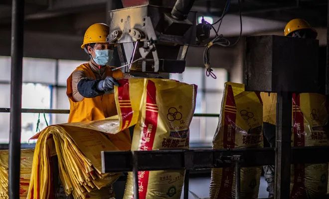 工人在云天化天安化工磷肥制造中心生产线进行袋装操作。新华社记者 江文耀 摄