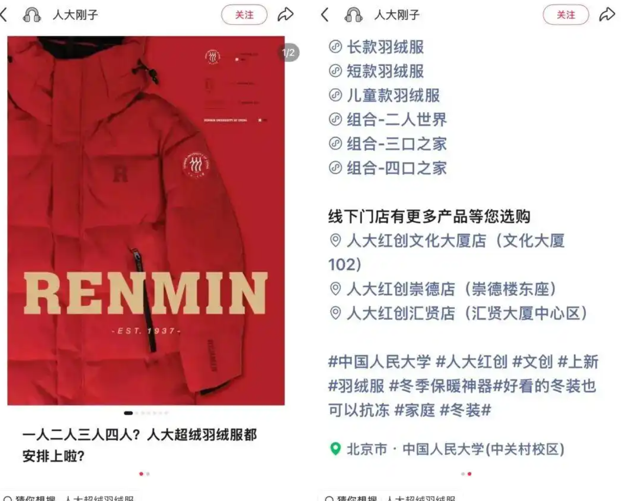 近日,“人大899元书记严选羽绒服卖断货”登上热搜。这并不是高校文创羽绒服第一次被“买爆”,中央戏剧学院、北京电影学院、中国传媒大学、哈尔滨工业大学等院校的文创羽绒服也曾在网络热销。