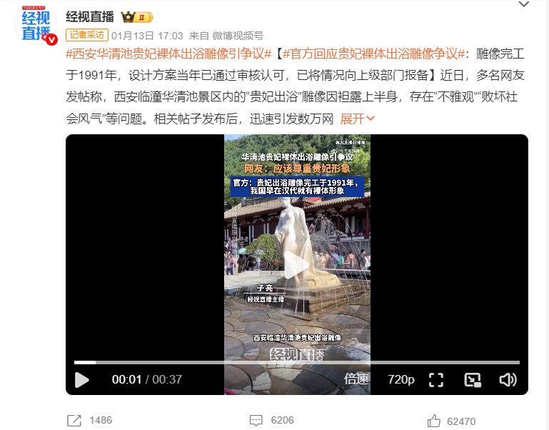 近日,西安临潼华清池景区内的“贵妃出浴”雕像因袒露上半身,被部分网友指责“不雅观”“败坏社会风气”等,引发关注和热议。对此,工作人员回应称,该雕像由我国著名雕塑家、广州美术学院教授潘鹤创作,于1991年正式安放于景区,其设计方案当年已通过地方政府文化机构的审核认可,创作初衷是烘托华清池作为皇家园林的历史氛围。