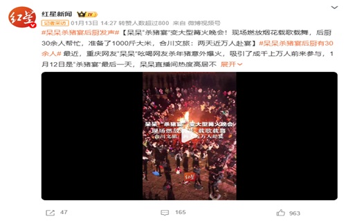 重庆合川女生“呆呆”发帖求助杀年猪走红后,湖北黄冈也上演了一幕类似的乡村狂欢。1月14日,英山县温泉镇百涧河村村民娜娜家举办的“杀猪饭”吸引了来自鄂、湘、川、苏等地的大量游客。