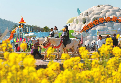 近日,安宁螳螂川的油菜花迎来盛花期,吸引众多市民游客前来踏春赏花。游客们或悠然漫步,或骑马漫游于田野之间,尽享惬意的田园时光。记者 黄兴能 摄