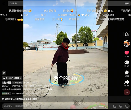 教育是一门“慢”工作。在广袤的乡村校园里,像视频中男孩一样,因成长环境、基础差异等暂时落后的孩子并不少见。视频中的陆老师,没有苛责,没有放弃,他敏锐地观察到普通跳绳不适合孩子的实际情况,亲手用软管和电线改造出“专属跳绳”;他牺牲自己的午休时间,进行一对一、手把手的引导。这种立足个体差异的因材施教,摒弃了浮躁的教育心态,真正把孩子的真实需求置于教育中心。正如面对众多家长的私信与共鸣,他真诚回复:“教育不必急,多一点关心,多一点陪伴,慢慢等孩子长大就好。”短视频的全网走红,正是社会对这种尊重成长规律、饱含人文关怀的温情教育的认同与渴望。
