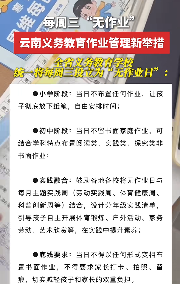 近日,云南省教育厅结合云南实际,就进一步加强义务教育学校作业管理作出工作安排,其中“全省义务教育学校统一将每周三设立为‘无作业日’”的举措引发社会关注。不少网友纷纷为该政策点赞,也有人呼吁尽快落实到位。