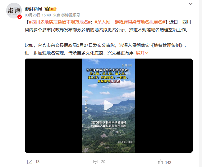 近日,四川省内多个县市的地名“整容”工作引发关注。宜宾市兴文县、达州市宣汉县、万源市等地民政部门相继发布公示,拟对一批如“杀人坳”“一群猪”“屙屎梁”等不规范地名进行更名,让地名更合规、更雅致,也更富有地方特色。