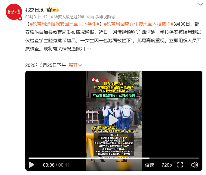 近日,一段“学生携带泡面入校,被手持仪器扫描检查的保安拦下”的视频在网络上引发广泛热议。对此,当地教育部门回应称:“根据《都安瑶族自治县民族实验初级中学安全教育管理办法》第十条规定,出于保障学生饮食安全和培养健康饮食习惯的考虑,当班保安对该学生进行了劝阻。在劝阻沟通过程中,保安与该生出现误会,学校领导第一时间抵达现场进行调处,与学生和家长充分沟通后获得了对方的理解与支持。”