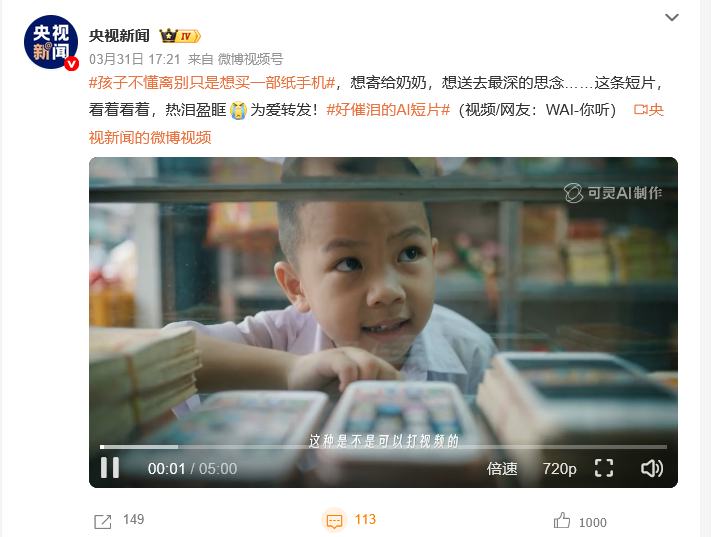 清明时节,一部名为《纸手机》的AI短片刷屏全网,两天播放量破千万。没有明星加持、没有大制作投入、没有密集宣发,深圳两位创作者仅用3天,靠AI工具完成全片制作,却让无数观众为“一部打不通电话的纸手机”落泪。该短片的走红,让我们看到,科技并非冰冷的工具,它正以温柔的姿态,唤醒并重塑着人们在骨子里的清明思念。