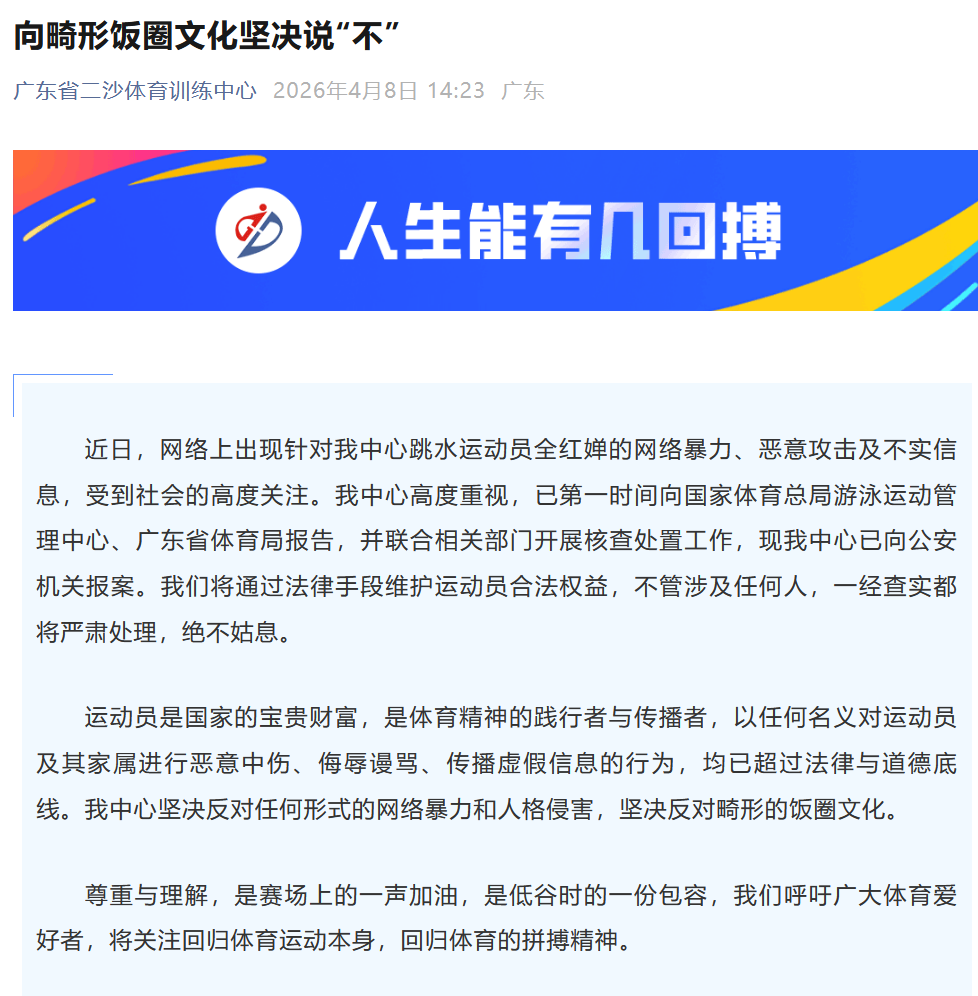 4月8日,跳水运动员全红婵所在的广东省二沙体育训练中心发文称,就她遭受网暴一事,已向公安机关报警。同日,国家体育总局游泳运动管理中心也就网络上出现针对全红婵等跳水运动员的网络暴力、恶意攻击及不实信息发表声明,表示坚决抵制畸形“饭圈”文化,对任何网络暴力和恶意攻击行为将严肃处理,绝不姑息。严厉声明,既是对功勋运动员的保护,也是对网络暴力的有力回击,更是向畸形“饭圈文化”传递出坚决“清零”的鲜明信号。