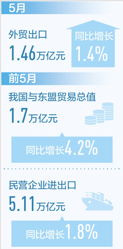 疫情来袭,外贸承压。面对困难,政策打出组合拳,企业开拓新市场。我国货物贸易出口在一季度同比下降后,迎来恢复性增长。4月实现出口1.41万亿元,同比增长8.2%;5月出口1.46万亿元,增长1.4%。