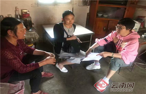 扶贫队队长李贞颖与队员深入群众家走访摸底资料图。云南网通讯员 李志瑶 摄。