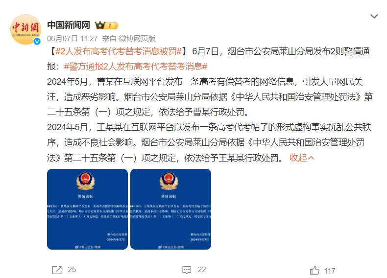6月7日下午,山东烟台市公安局莱山分局发布2则警情通报:2024年5月,曹某在互联网平台发布一条高考有偿替考的网络信息,引发大量网民关注,造成恶劣影响。烟台市公安局莱山分局依据《中华人民共和国治安管理处罚法》第二十五条第(一)项之规定,依法给予曹某行政处罚。2024年5月,王某某在互联网平台以发布一条高考代考帖子的形式虚构事实扰乱公共秩序,造成不良社会影响。烟台市公安局莱山分局依据《中华人民共和国治安管理处罚法》第二十五条第(一)项之规定,依法给予王某某行政处罚。
