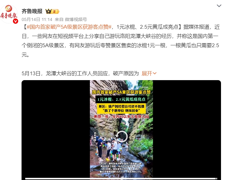 “景区物价会直接影响游玩体验,龙潭大峡谷内外同价,让我们感受到了久违的用心和诚意。”近日,湖北武汉游客在河南洛阳旅游,1元的冰棍、2元的矿泉水、2.5元的黄瓜等平价商品,让他对龙潭大峡谷景区赞不绝口。今年5月起,曾因运营公司资不抵债进入破产程序的河南洛阳龙潭大峡谷景区,因平价商品走红网络。“五一”期间,该景区接待游客9.6万人次,同比增长23%,单日最高接待量达2.3万人次,创历史高峰。此后,景区每天仍有四五千人的客流量,较去年同期有明显增长。