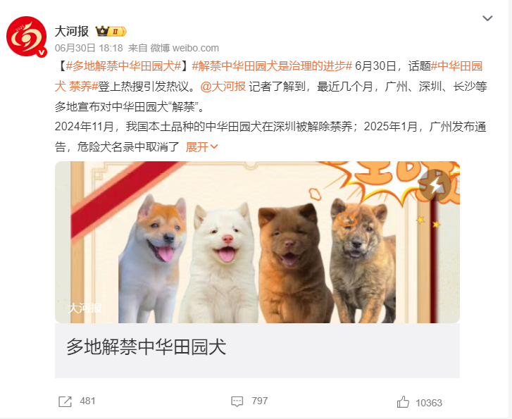 近日,解禁中华田园犬的话题持续引发热议。据媒体报道,目前多地陆续解禁中华田园犬,包括广州、深圳、长沙等地将中华田园犬移出《危险犬只目录》。