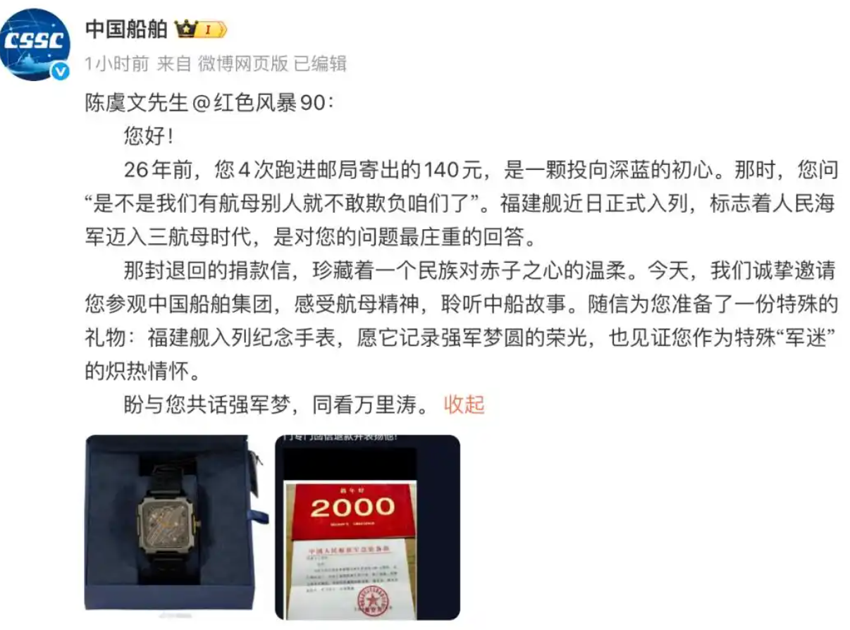 “您好!26年前,您4次跑进邮局寄出的140元,是一颗投向深蓝的初心。那时,您问‘是不是我们有航母别人就不敢欺负咱们了’。福建舰近日正式入列,标志着人民海军迈入三航母时代,是对您的问题最庄重的回答”……近日,中国船舶集团有限公司邀请“捐款造航母”当事人陈虞文前往参观、感受航母精神,还随信附赠一块福建舰入列纪念手表,引发关注。