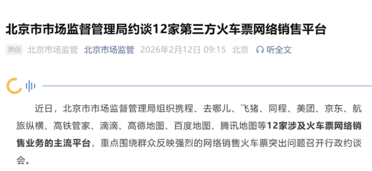 近日,北京市市场监督管理局对携程、飞猪等12家第三方火车票网络销售平台开展行政约谈,直指虚假宣传、捆绑销售、虚构购票特权等行业乱象。恰逢春运出行高峰,此次约谈是一次及时的行业纠偏,回应了万千旅客对公平购票、舒心出行的迫切期待。