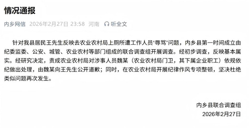 近日,河南省南阳市内乡县居民王先生在社交平台发布视频称,其到该县农业农村局上厕所时遭工作人员辱骂,引发舆论关注。2月27日,当地联合调查组发布通报:责成农业农村局对涉事人员魏某(农业农村局门卫,其下属企业职工)依规依纪做出处理,由魏某向王先生公开道歉;同时,在农业农村局开展纪律作风专项整顿,坚决杜绝类似问题再次发生。