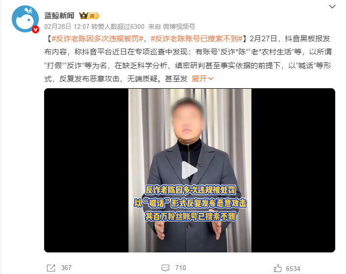 近日,抖音平台通过“抖音黑板报”发布处置公告称,有账号“反诈*陈”“老*农村生活”等,以所谓“打假”“反诈”等为名,在缺乏科学分析、缜密研判甚至事实依据的前提下,以“喊话”等形式,反复发布恶意攻击、无端质疑,甚至发布侮辱他人人格及企业声誉的信息。目前,已明确对“反诈老陈”相关账号作出从严处置,其主账号目前已无法搜索到。