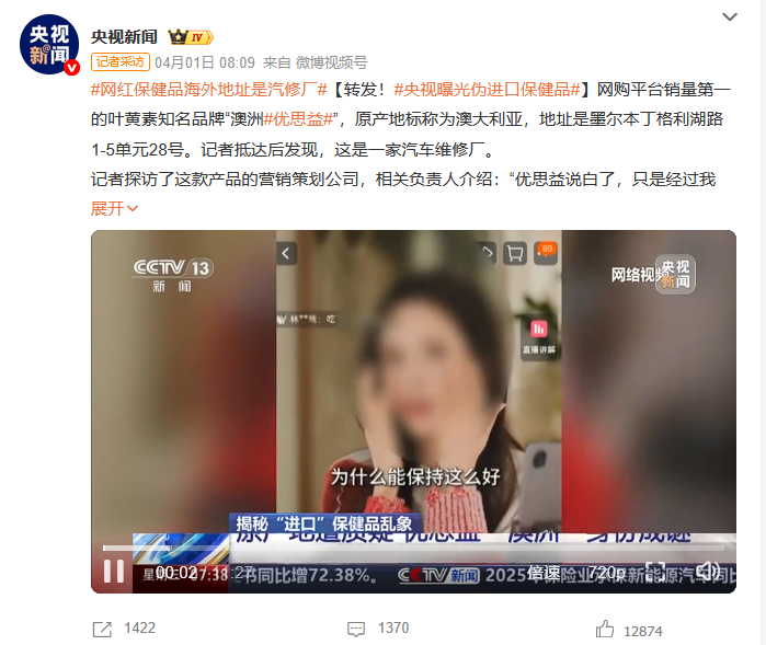 近日,央视新闻曝光,抖音、天猫销量第一的叶黄素知名品牌“澳洲优思益”,标称澳大利亚原产,实则为国内生产,标注的墨尔本生产地址竟是汽车维修站,品牌故事、国际大奖全是伪造,明星专家背书也靠花钱雇佣。事件发酵后,涉事企业已被立案调查,但如此闹剧不能以“关门大吉”收场。