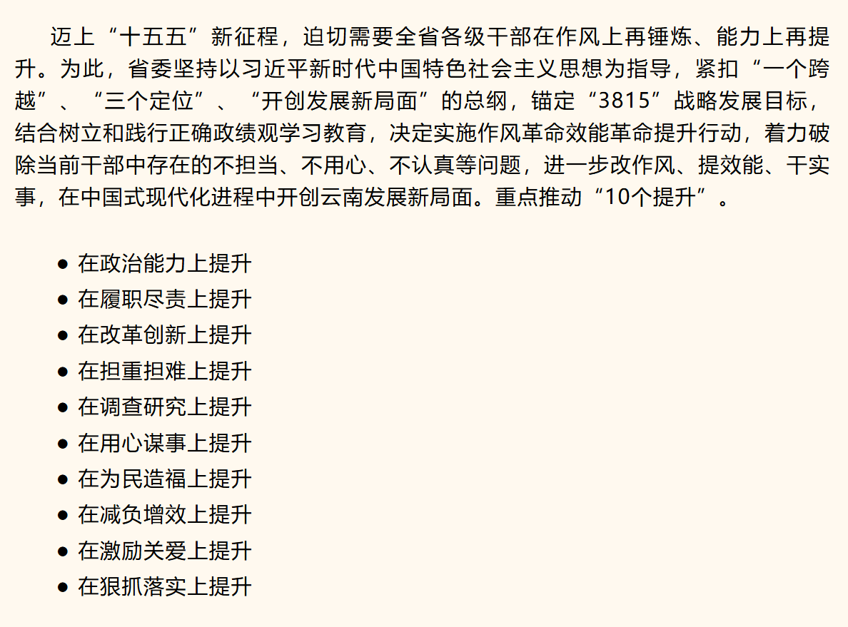 迈上“十五五”新征程,迫切需要全省各级干部在作风上再锤炼、能力上再提升。近日,省委决定实施作风革命效能革命提升行动,重点推动政治能力、履职尽责、改革创新、担重担难、调查研究等“10个提升”。这是云南锚定“3815”战略发展目标、在中国式现代化进程中开创发展新局面的关键一招,也是树立和践行正确政绩观、提升干部队伍能力素质的有力举措。